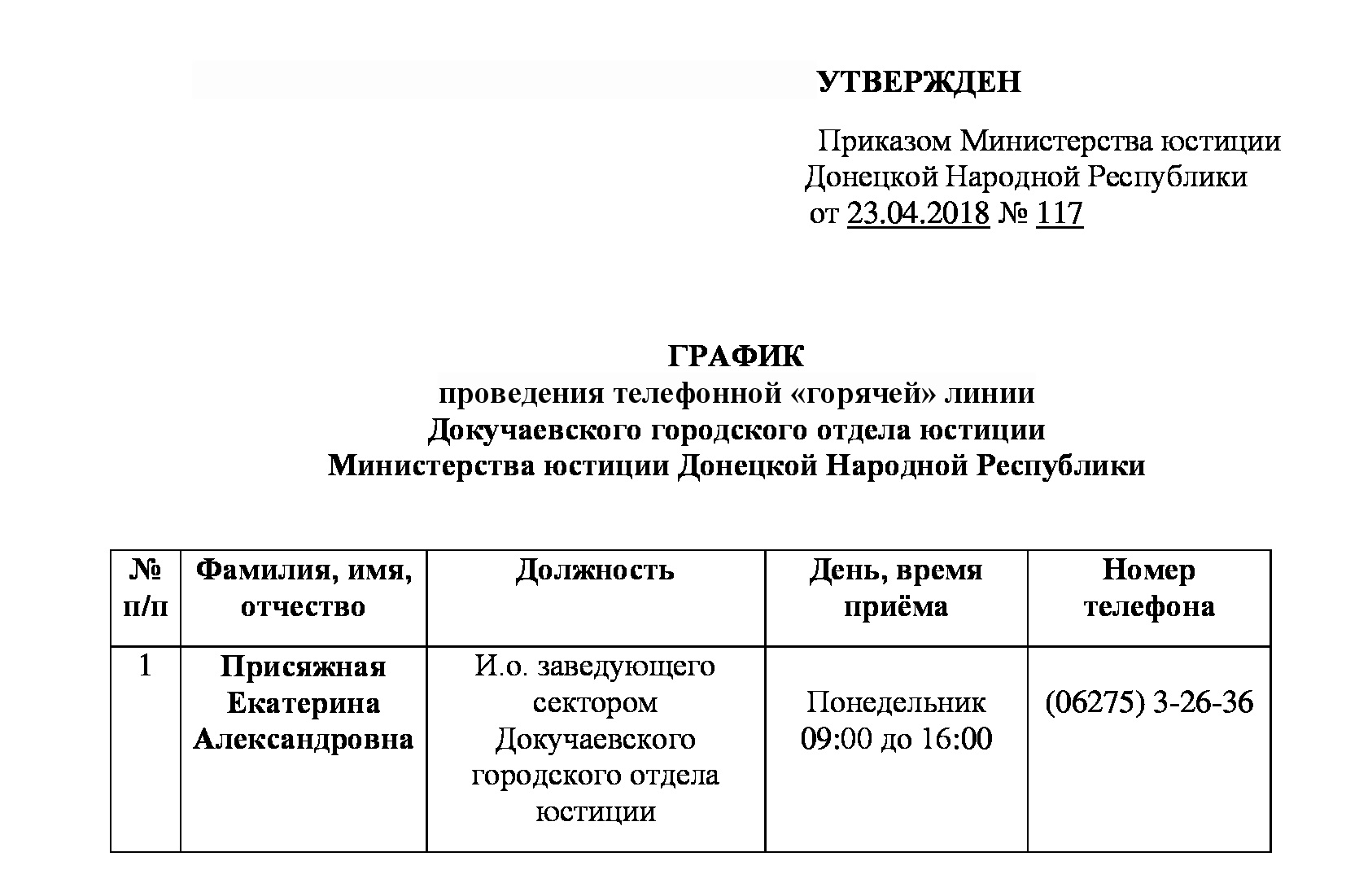 Управление Пенсионного фонда Донецкой Народной Республики в г. Докучаевске сообщает, что в управлении работает «прямая телефонная линия». Руководители управления проконсультируют вас по вопросам пенсионного законодательства.