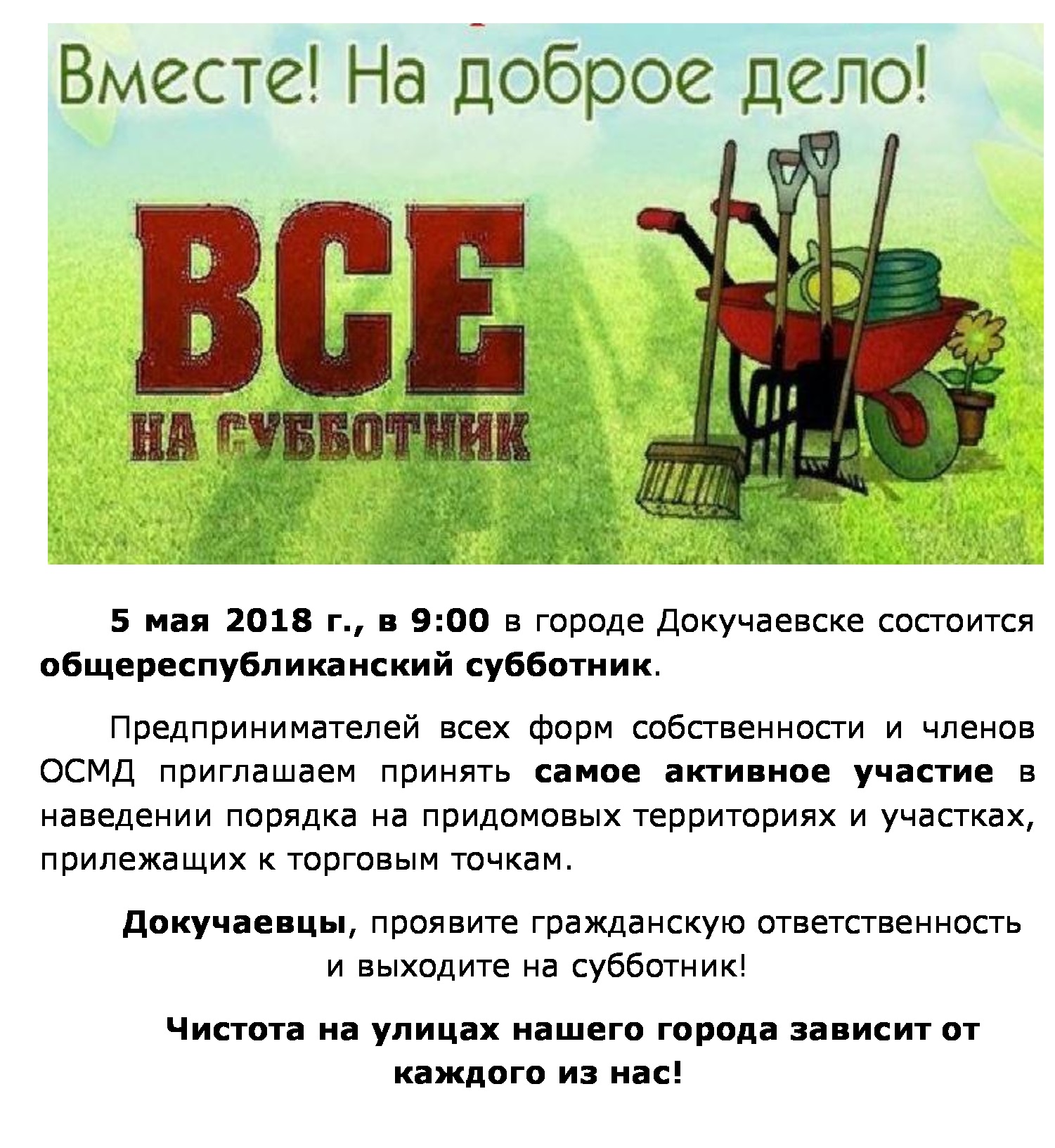 21 апреля 2018 г. в городе Докучаевске прошёл плановый республиканский субботник. Представители организаций и предприятий занимались уборкой улиц и прилежащих территорий.