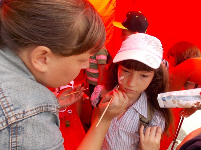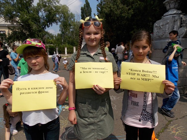 Не остались в стороне в этот день и активисты местных отделений ОД «Донецкая Республика» и ОО «Молодая Республика». Ими была организована городская акция «Мы живем в Докучаевске – мы хотим ЖИТЬ!». Она не оставила безразличным никого, кто был в этот день на площади: импровизированные значки прикрепляли к одежде и дети, представители администрации, и учителя школ, и прохожие. Также красками на лицах всем желающим рисовали белых голубков – символ мира.