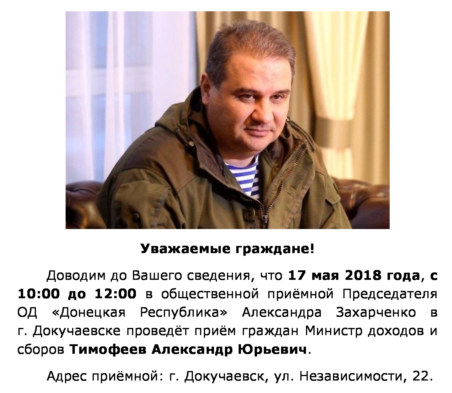 Доводим до Вашего сведения информацию о работе Общественной Приёмной Председателя ОБЩЕСТВЕННОГО ДВИЖЕНИЯ «ДОНЕЦКАЯ РЕСПУБЛИКА» Захарченко А.В.,