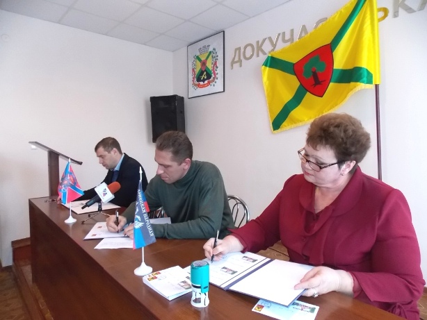 Город Докучаевск был создан - 21 июня 1954 года и назван в честь Василия Васильевича Докучаева, известного геолога и почвоведа, основателя русской школы почвоведения. г. Докучаевск называют городом, цветущим на камне. Благодаря работникам Докучаевского флюсо-доломитного комбината, маленький, казалось бы ничем не примечательный городок Донецкой области, стал излюбленным местом, куда стремятся взрослые и дети. Трудовым коллективом на месте заброшенного объекта детского отдыха, создал новое, не просто место отдыха, а центр воссоединения взрослых и детей с природой в самых ярких ее красках - Докучаевский зоопарк. Маркой нового стандарта стала иллюстрация малого герба города Докучаевск. Авторы герба Олег Киричок и Владимир Мартыненко. Их герб победил в конкурсе, который проводила комиссия под руководством Докучаевского городского головы Л. Самборского. 26 декабря 2000 года герб был официально принят решением Докучаевского городского совета. В специальном гашении, которое состоялось 01 декабря 2015 года в зале заседания администрации г.Докучаевска, приняли участие первый заместитель Министра связи Донецкой Народной Республики Никита Александрович Бородин, и.о. главы администрации г. Докучаевск Александр Юрьевич Качанов и директор Центра Почтовой связи пгт. Старобешево ГП «Почта Донбасса» Алла Николаевна Васильева.