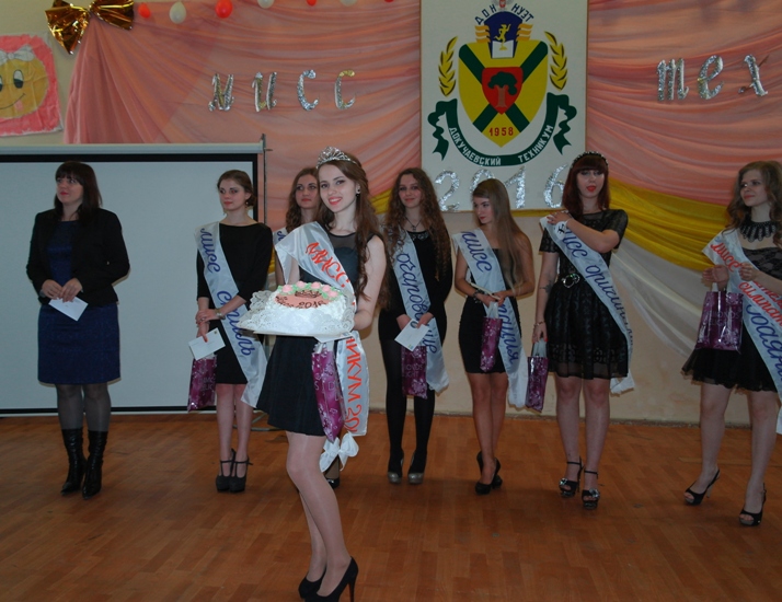 10 марта в ГПОУ Докучаевский техникум ДонНУЭТ состоялся ставший уже традиционным конкурс красоты, грации и творчества «Мисс техникума -2016». За корону и звание первой леди техникума соревновались активные и талантливые студентки: Курская Владислава, Дзябко Лилия, Шевкопляс Дарина, Алехина Диана, Налесная Диана, Цыпляк Анастасия и Лазарюк Анастасия. Конкурс прошёл в несколько этапов: «Визитка», «Кулинарный шедевр» - представление блюда народов мира, «Непревзойденный талант», и девушки продемонстрировали свою грациозность, красоту, умение подать себя в конкурсе «Дефиле». Компетентному жюри в составе: Дяговец А. П., заведующего сектором молодежи, спорта и туризма администрации г. Докучаевска, Станислава Андреева, руководителя отдела маркетинга, Баркалова В. К., директора центра культуры и досуга имени Пушкина, Зехова А. С. и Глебова Г. В., преподавателей техникума, - выбрать победительницу было непросто. Для каждой из семи девушек этот конкурс стал собственным бенефисом, маленькой победой над собой и большим шагом вперед. В итоге места распределились следующим образом: «Мисс техникума-2016» стала Лазарюк Анастасия, «Мисс Очарование» - Алехина Диана, «Мисс Оригинальность» - Налесная Диана, «Мисс Обаяние» - Цыпляк Анастасия, «Мисс Стиль» - Шевкопляс Дарина, «Мисс Артистичность» - Дзябко Лилия, «Мисс Грация» - Курская Владислава. Зрители выбрали свою победительницу: «Мисс зрительских симпатий» стала Цыпляк Анастасия.