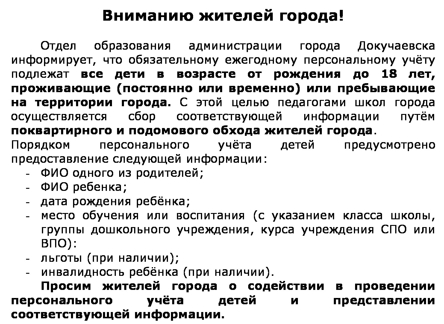 Отдел образования администрации города Докучаевска информирует, что обязательному ежегодному персональному учёту подлежат все дети в возрасте от рождения до 18 лет, проживающие (постоянно или временно) или