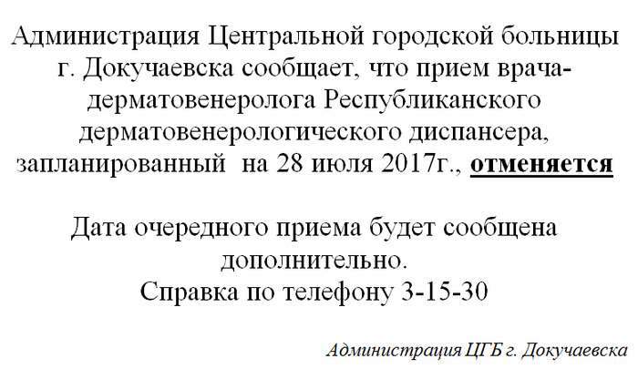 13:29 прием врача-дерматовенеролога запланированный на 28 июля отменяется | |