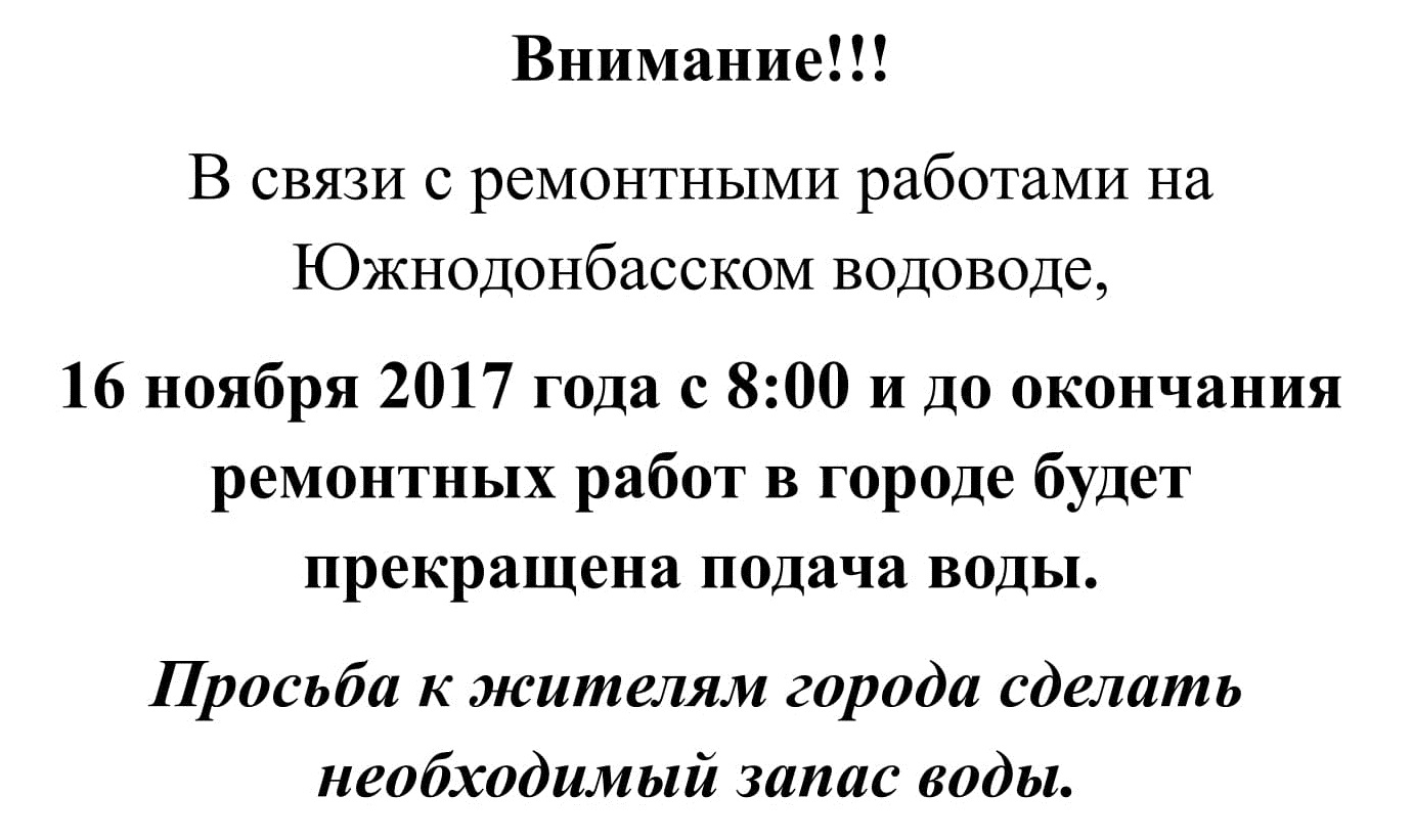 Главная » 2017 » Ноябрь » 15 » Ремонт водовода - сделайте запасы воды!