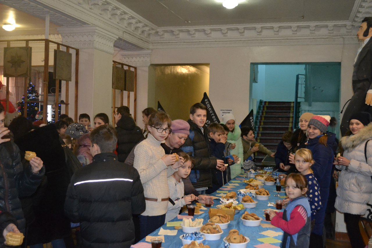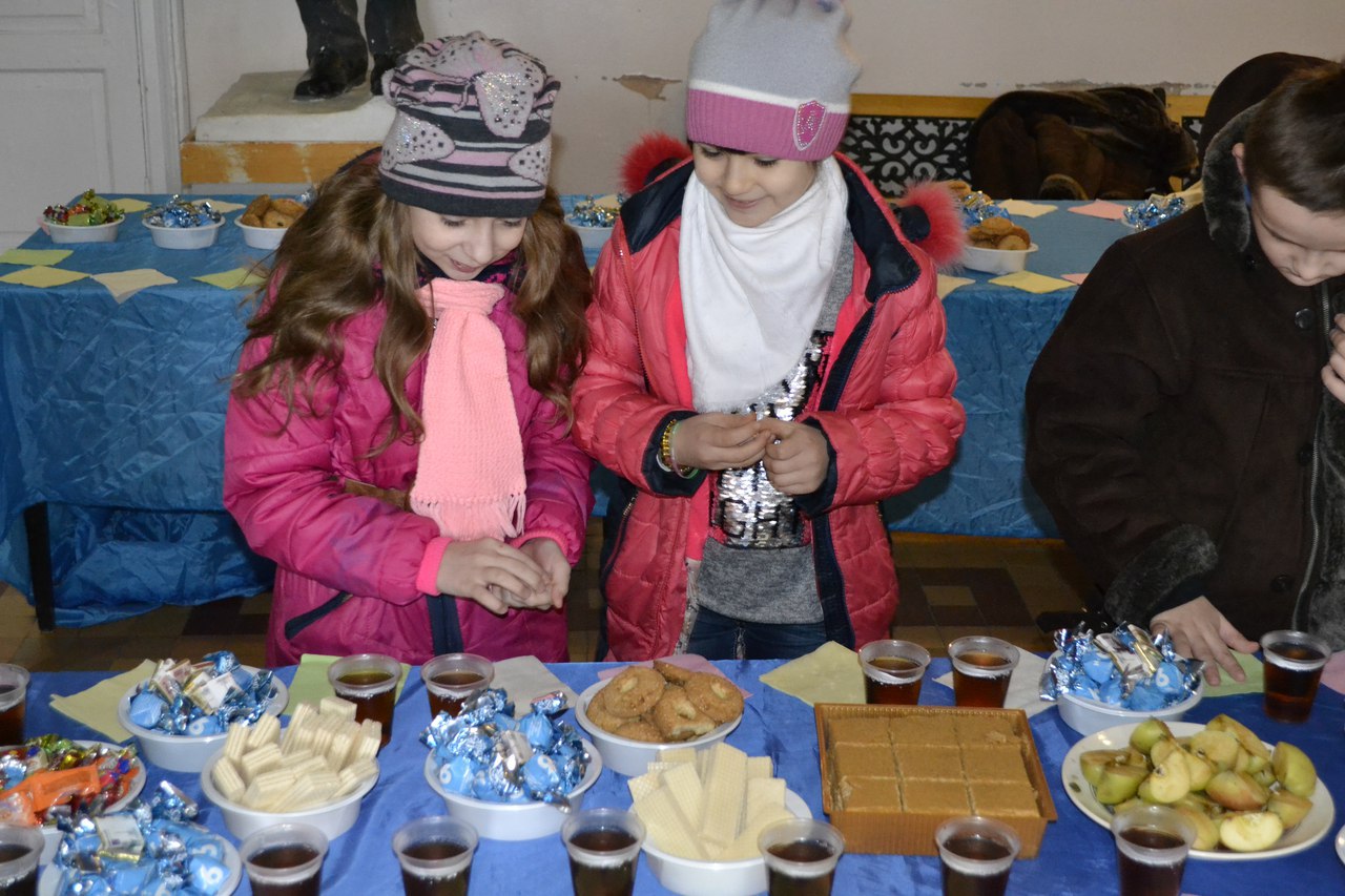 Но на этом мероприятие не закончилось, по окончании мультфильма в вестибюле дворца культуры детей ожидал сладкий стол.