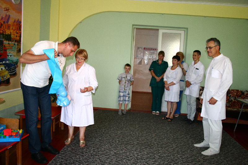 Вручив коллективу детские игрушки для игровой комнаты отделения, Александр Юрьевич отметил: «Докучаевцы помнят, что было с отделением в феврале 2015 года, когда на территории больничного комплекса приземлились снаряды установки «Град»… Больше двух лет после обстрела работать и лечить детей в отделении возможности не было. Сейчас, благодаря усилиям руководства и медицинского персонала больницы, при содействии администрации города, отделение возобновляет свою работу. Дети — это наше будущее, и обеспечение их здорового роста и развития должно быть нашей важнейшей задачей. Отдельное спасибо главврачу инфекционного отделения Геннадию Викторовичу Шаповалову, который в свое время взял на себя бремя ответственности за лечение маленьких докучаевцев. Но дети требуют особых условий, особого внимания, и потому открытие детского отделения давно было наболевшим вопросом для главного врача Сергея Петровича Скрипаля, - добавил руководитель администрации. - Я рад, что теперь дети смогут получать лечение в специализированном детском отделении, но желаю, чтобы необходимость в лечении возникала как можно реже. Желаю всем крепкого здоровья и мира! Медицинскому персоналу желаю успехов и терпения в их нелёгком труде!» Главный врач представил нового заведующего детским отделением, отметив, что появление специалиста в области педиатрии сыграло немалую роль в решении возобновить работу отделения.
