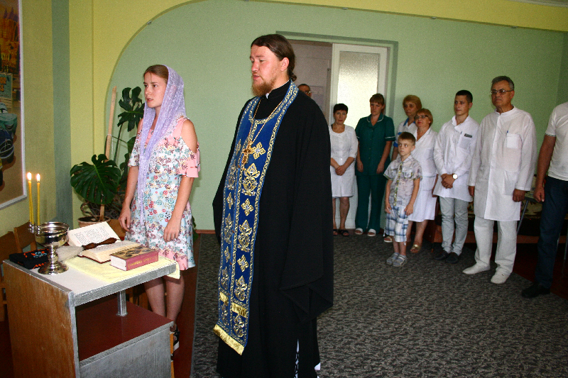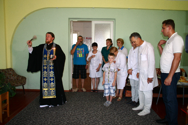 Медицинский персонал отделения тщательно готовился к этому важному событию. В отделении сейчас проведен необходимый ремонт, который делали даже в выходные дни, чтобы приблизить дату открытия. В просторном отделении чисто, красиво и по-домашнему уютно. Напомнив присутствующим о том, что открывается детское отделение в канун православного праздника - Дня памяти одного из самых почитаемых на Руси святых - Пантелеймона целителя, настоятель Свято-Вознесенского храма, протоиерей отец Георгий прочитал молебен и окропил святой водой палаты, кабинеты и игровую комнату детского отделения Докучаевской городской больницы.